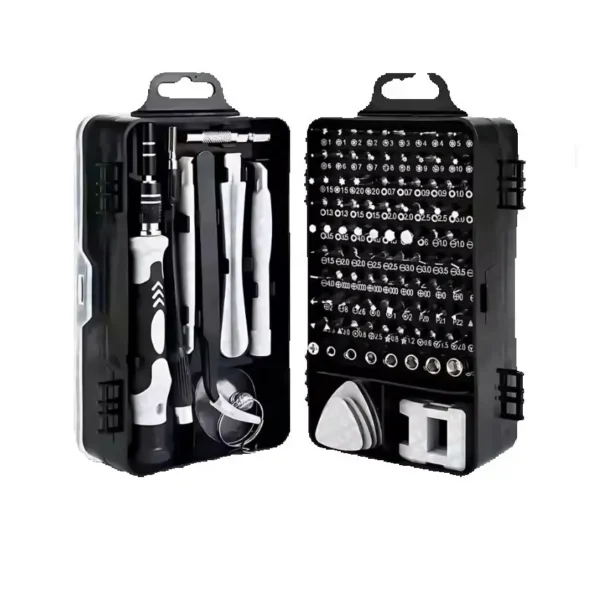 Kit de chaves de precisão com 115 peças, ideal para manutenção de celulares, notebooks e eletrônicos. Completo, resistente e com maleta organizadora.