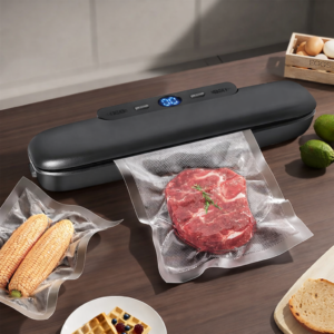 Seladora a vácuo elétrica SaengQ 220V com display digital, ideal para conservar alimentos por até 8x mais tempo. Compacta, fácil de usar e perfeita para carnes, legumes, frutas e alimentos secos. Design moderno para uso doméstico ou comercial.